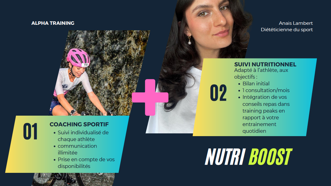Nutri Boost by alpha training est la solution unique d'entrainement en vélo, triathlon, course à pieds couplée à un suivi nutritionnel précis établi en fonction de votre entrainement par une diététicienne du sport.